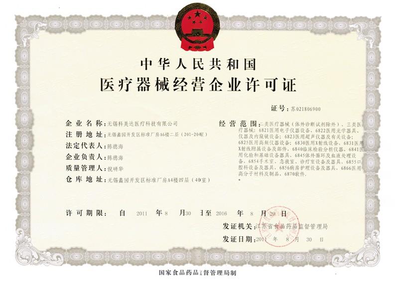 無錫科美達醫療器械有限公司于2011年8月順利取得中華人民共和國醫療器械企業經營許證。